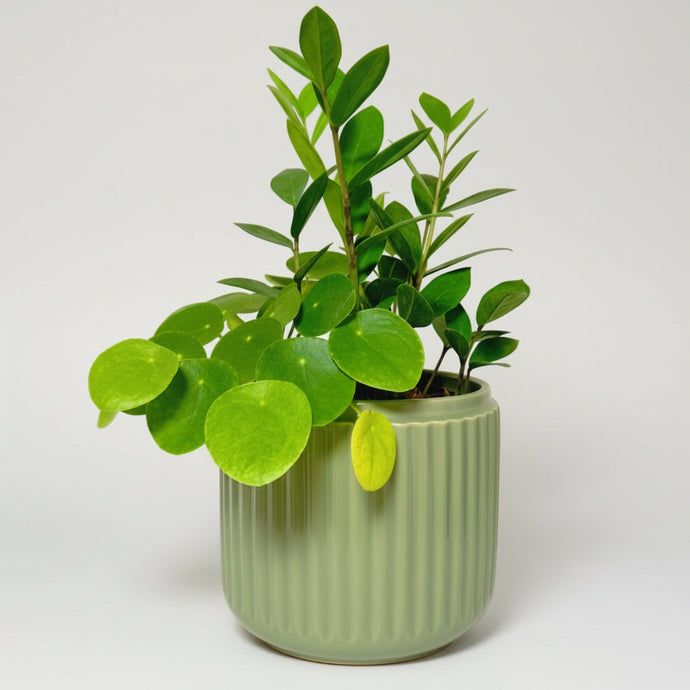 Maceta Ceramica Rayas Verdes con planta Zamioculca y Pilea Peperomioides